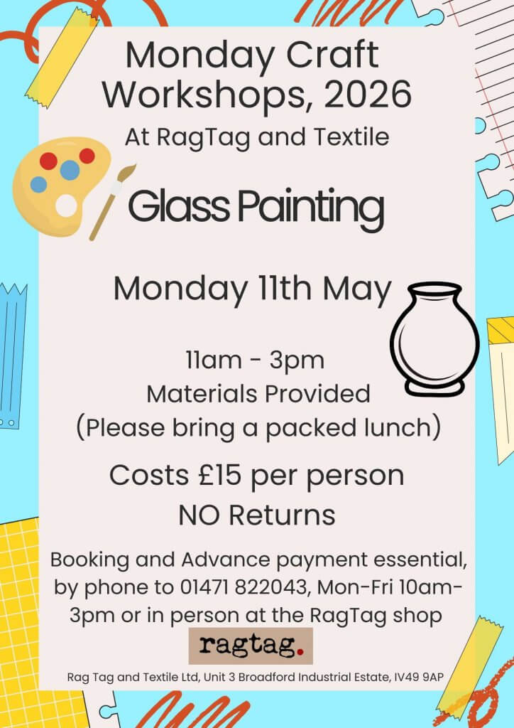 Have a go at Glass Painting in May. A relaxed session where you can use glass paints to decorate a vase, make a card, make a window decoration or just create a picture. Support will be given and all equipment provided. If you do want to bring your own glass item...