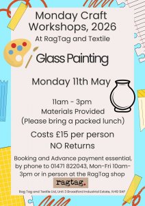Have a go at Glass Painting in May. A relaxed session where you can use glass paints to decorate a vase, make a card, make a window decoration or just create a picture. Support will be given and all equipment provided. If you do want to bring your own glass item along, you are more than welcome.